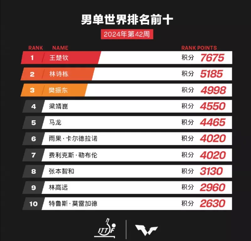 WTT更新第42周宇宙排行,王楚钦、孙颖莎继续包揽宇宙第一。