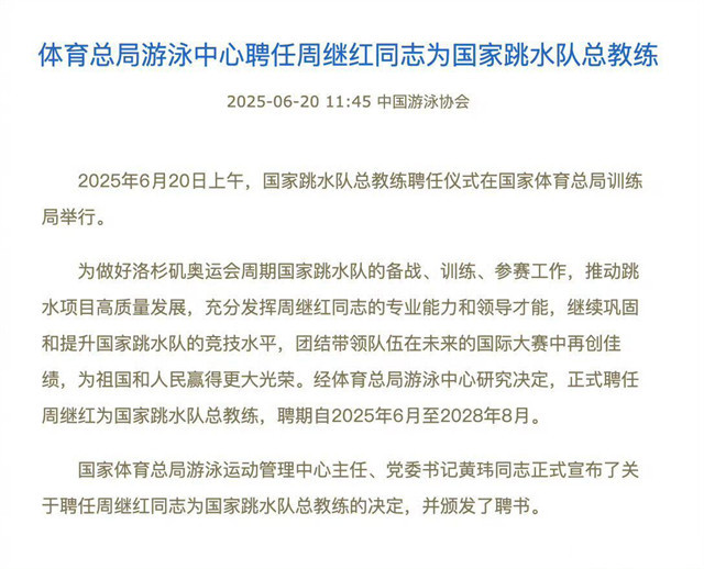 2025年3月,体总发布音问称,周继红因为到了退休年级,被免去游水通顺科罚中心主任、国度跳水队领队职务,按干系规章办理退休手续。本觉得周继红不错保重天年了,没念念到,在4月份,周继红当选中国泳协掌门东谈主。好多东谈主齐看不懂,因为年青有活力如姚明、年富力强如刘国梁,为了不迟误继任者好意思满备战洛杉矶奥运会主动辞去协会掌门,为啥周继红还要陆续在协会来回下去呢?